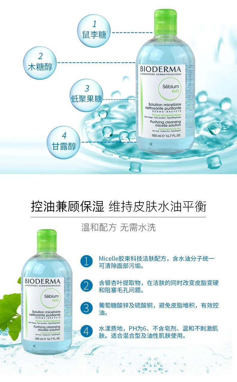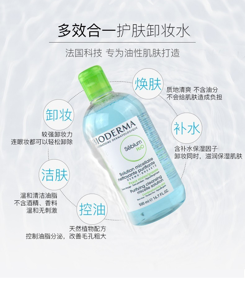 贝德玛卸妆水集卸妆和护肤于一瓶,本身是为皮肤研究的,卸妆温和,不紧绷,不含酒精不刺激,水状不油腻。 蓝水(蓝盖蓝色水):清洁。适合混合性及油性肌肤。 粉水(粉盖透明水):适合中性,干性,发红,发痒,发痛皮肤。 此款为蓝水。