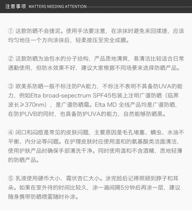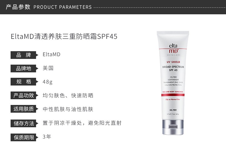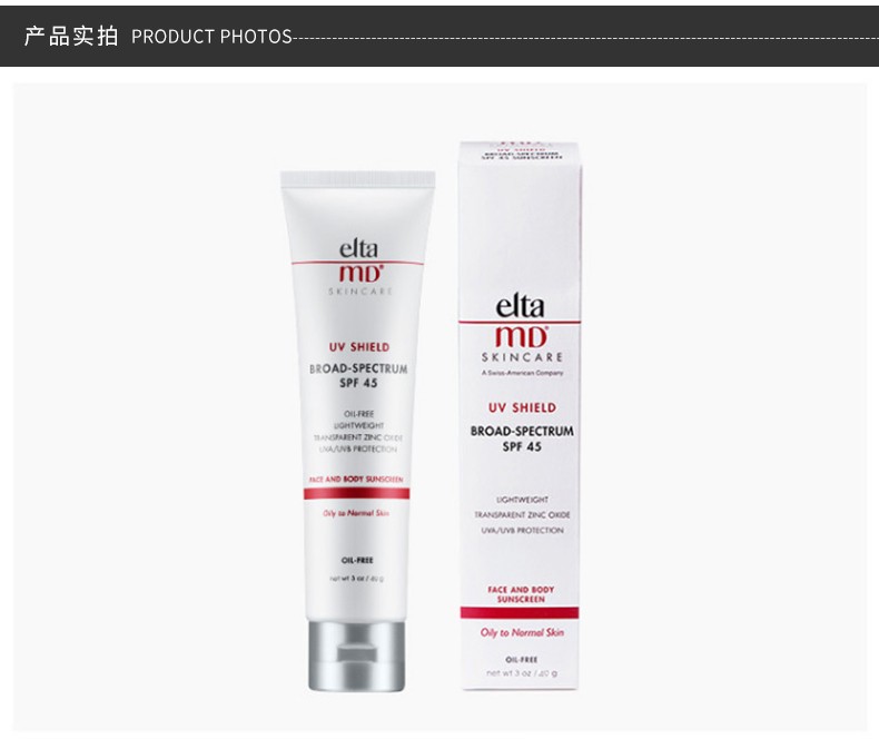 无油防晒乳不想有些防晒霜只采用了物理或者是化学防晒剂成分,它是采用了物理防晒剂为主,同时配合了化学防晒剂为辅,所以elta md无油防晒乳既能够阻挡住紫外线UVB,也能够阻挡紫外线UVA,满足肌肤的双重防晒需求哟~同时elta md无油防晒乳本身就没有采用什么油性成分,而里面含有的氧化锌成分还具有一定的控油作用,所以elta md无油防晒乳真的非常适合油性肌肤使用哟~最最主要的是elta md无油防晒乳里面不含有刺激性成分,不会给肌肤带来任何的刺激感,敏感肌肤使用也无压力哟