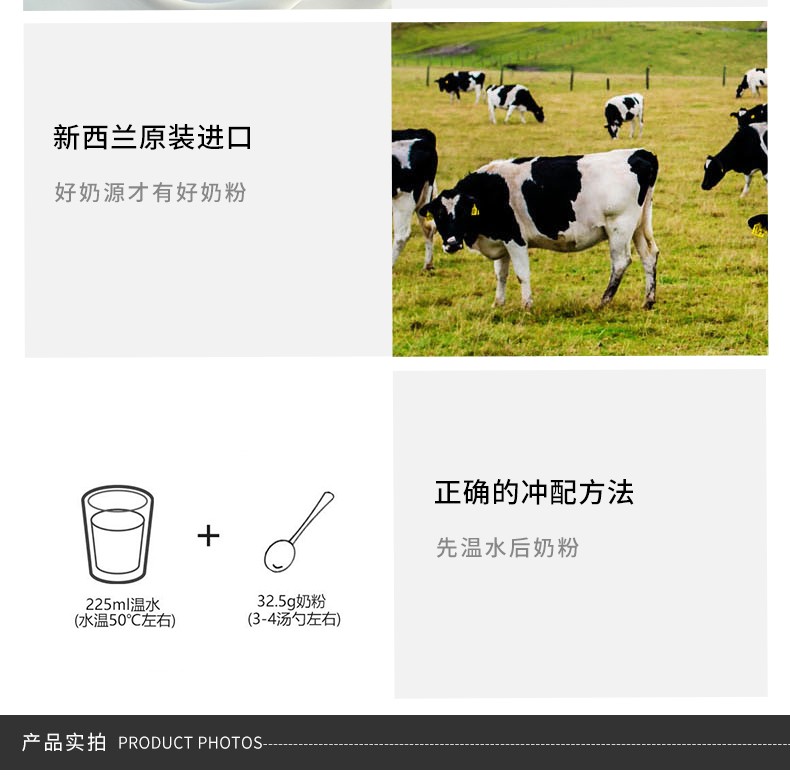 新西兰原装进口,专业品质保证,空气清新无污染,来自南太平洋的洁净水源,孕育出健康乳牛,为成年人带来营养