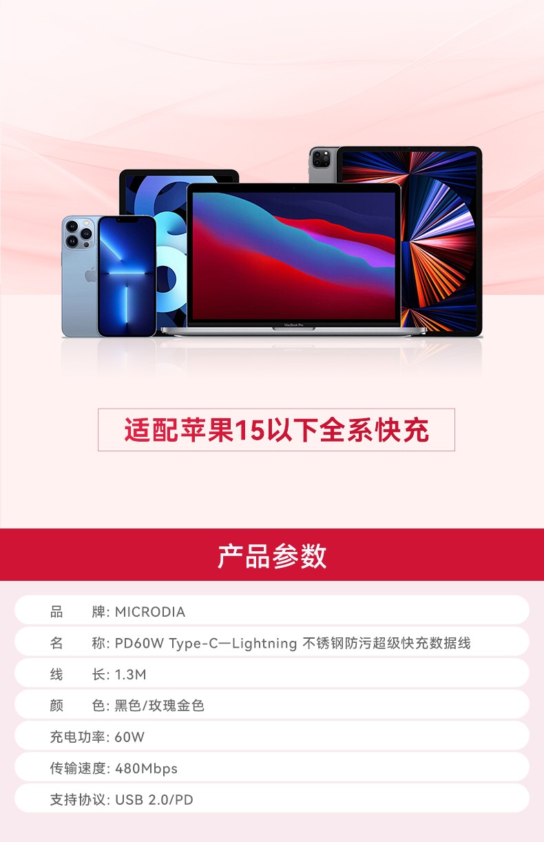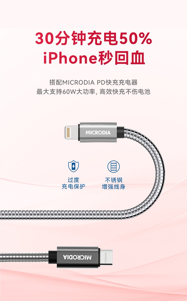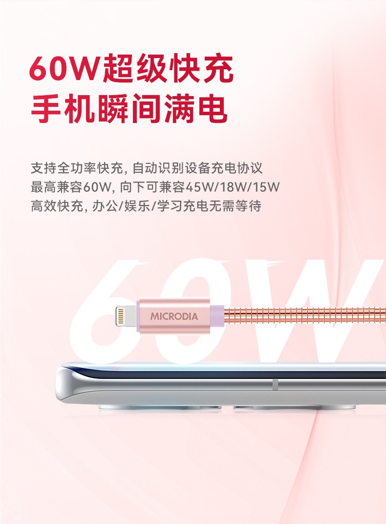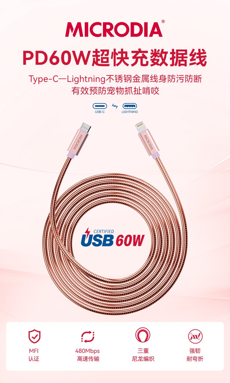 MICRODIA/高科迪 ExeCable 60W USB-C to Lightning 铜管快充数据线